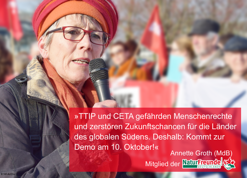 „Die geplanten Abkommen sind das geistige Produkt der neoliberalen Deregulierung – einer Ideologie, die im Jahr 2008 in die Finanzkrise geführt hat", erklärte Michael Müller, Bundesvorsitzender der NaturFreunde Deutschlands und Auftaktredner der Demo in Berlin: "Die Hauptverantwortlichen und die ideologischen Träger der Freihandelsabkommen sind die Union und auch Bundeskanzlerin Angela Merkel. Umso mehr richtet sich die Hoffnung auf die SPD. Sie muss die Verträge stoppen, wenn sie ihrer Verantwortung gerecht werden will."