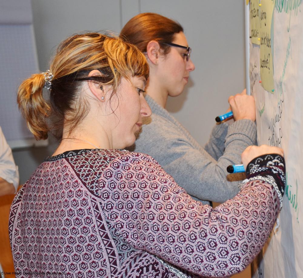 In der ersten Arbeitsgruppe wurde über konkrete Möglichkeiten der Mitgestaltung der NaturFreunde an einer sozial-ökologischen Transformation debattiert. Geäußert wurde zum Beispiel die Idee, abstrakte Themen wie die Energiewende über die Auseinandersetzung mit regionalen Beispielen wie der Braunkohleförderung in der Lausitz anzugehen. Auch die Verknüpfung politischer Inhalte mit dem Natursport, beispielsweise über thematische Wanderungen und die Integration von Bildung für nachhaltige Entwicklung in die Natursport-Ausbildungen wurden vorgeschlagen. Hürden und Lösungsansätze für die Umsetzung dieser Ideen wurden diskutiert. Auch wurde darauf hingewiesen, dass es von der Bundesebene bereits thematische Angebote in Form von Argumentationspapieren gibt und weitere zu Themen wie der EU-Afrika-Politik oder der EU-Agrarpolitik folgen werden.